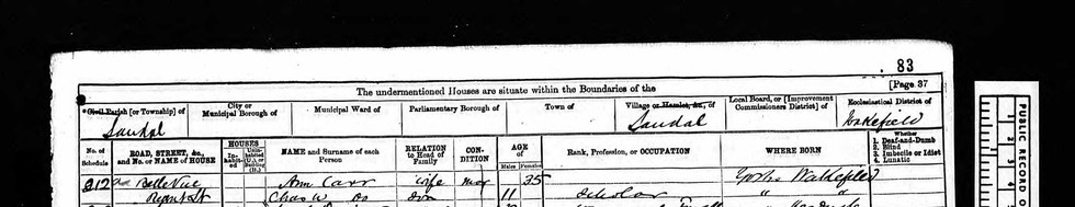 Charles William Carr, 1871 England Census. Archive reference: RG10; RD Wakefield; Sub district St. Sandal; Piece No. 4615; Folio 83; Page 37; Schedule 212, digital image, Ancestry. England, Wales & Scotland Census. Original held by The National Archives, Kew, London. 1871 England Census - Ancestry.co.uk